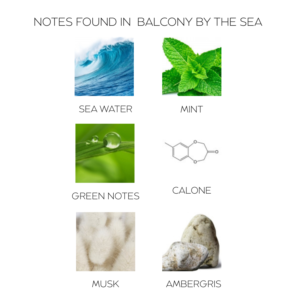 Balcony by the sea features notes which are easily identified like Sea Water, Mint, Green Notes, Calone, Musk and Ambergris.
